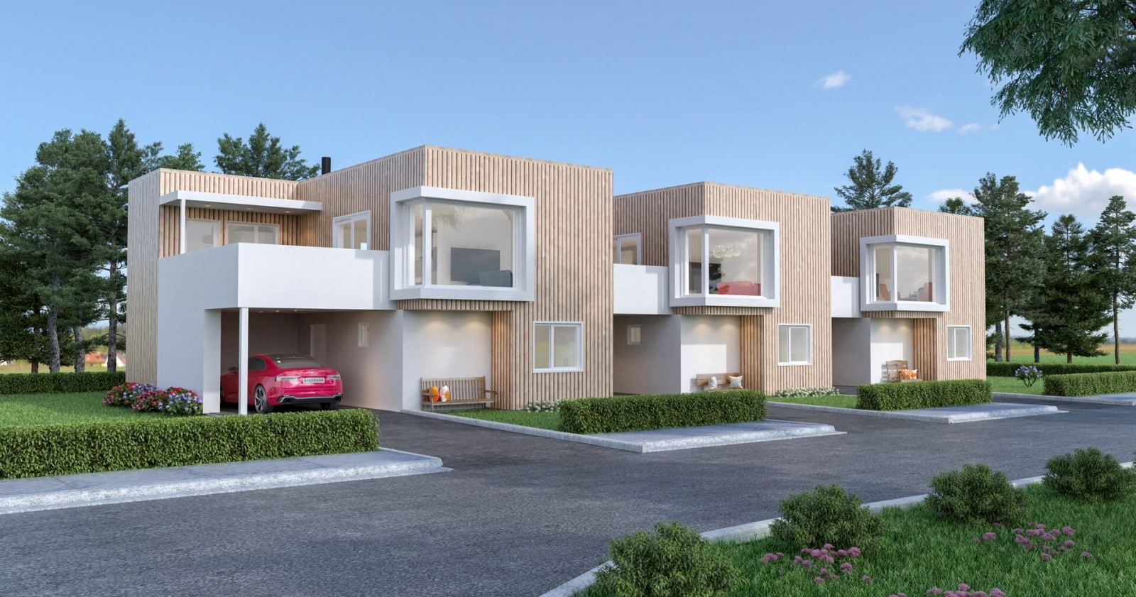 En kompakt bolig med integrert carport og stor terrasse. Her har man stor fleksibilitet når det gjelder antall enheter. Om man ønsker flere enheter i rekke, har man muligheten til det. Elementer som glatte veggflater sammen med stående kledning gir enhetene et stilrent og moderne uttrykk.